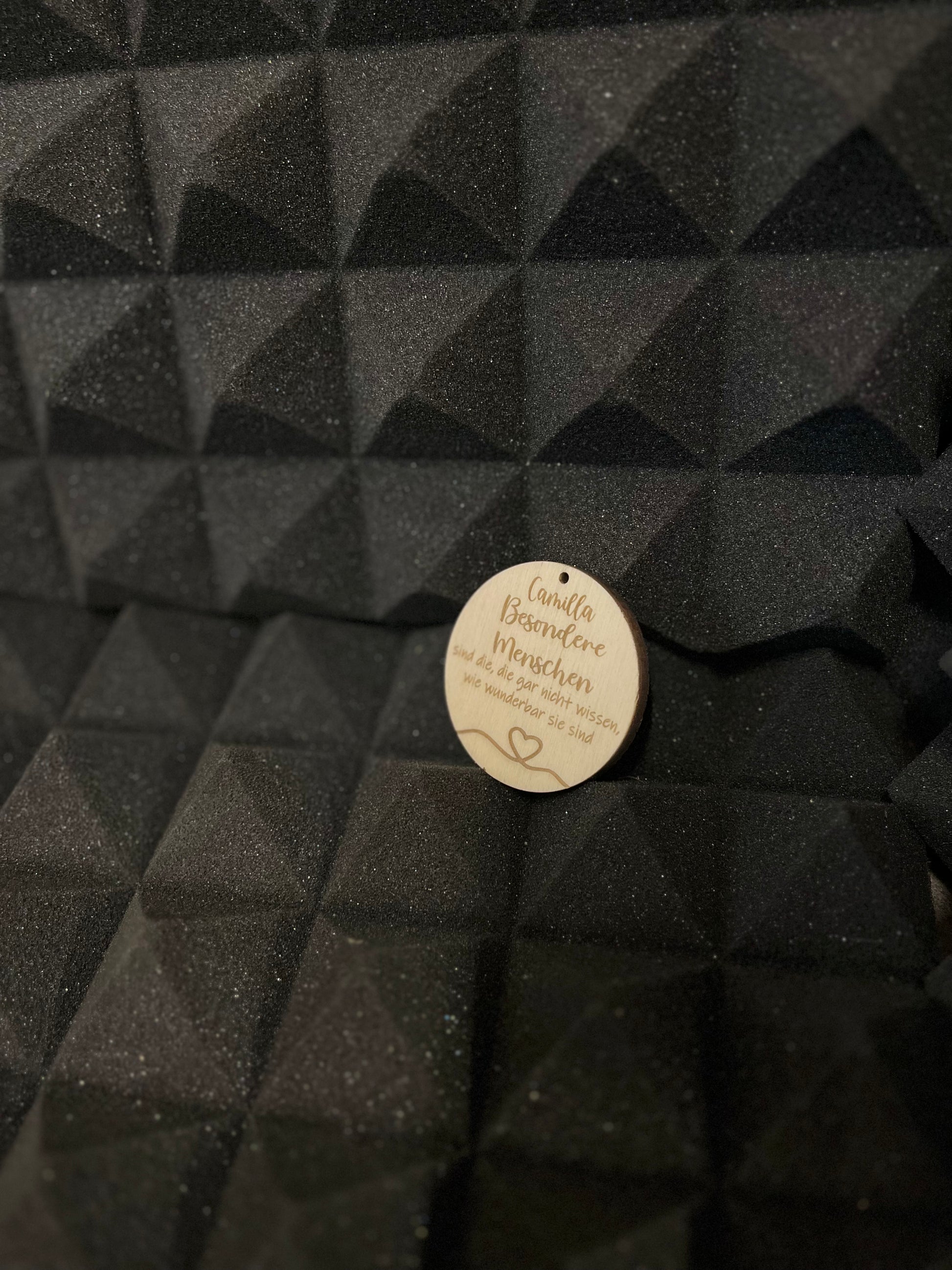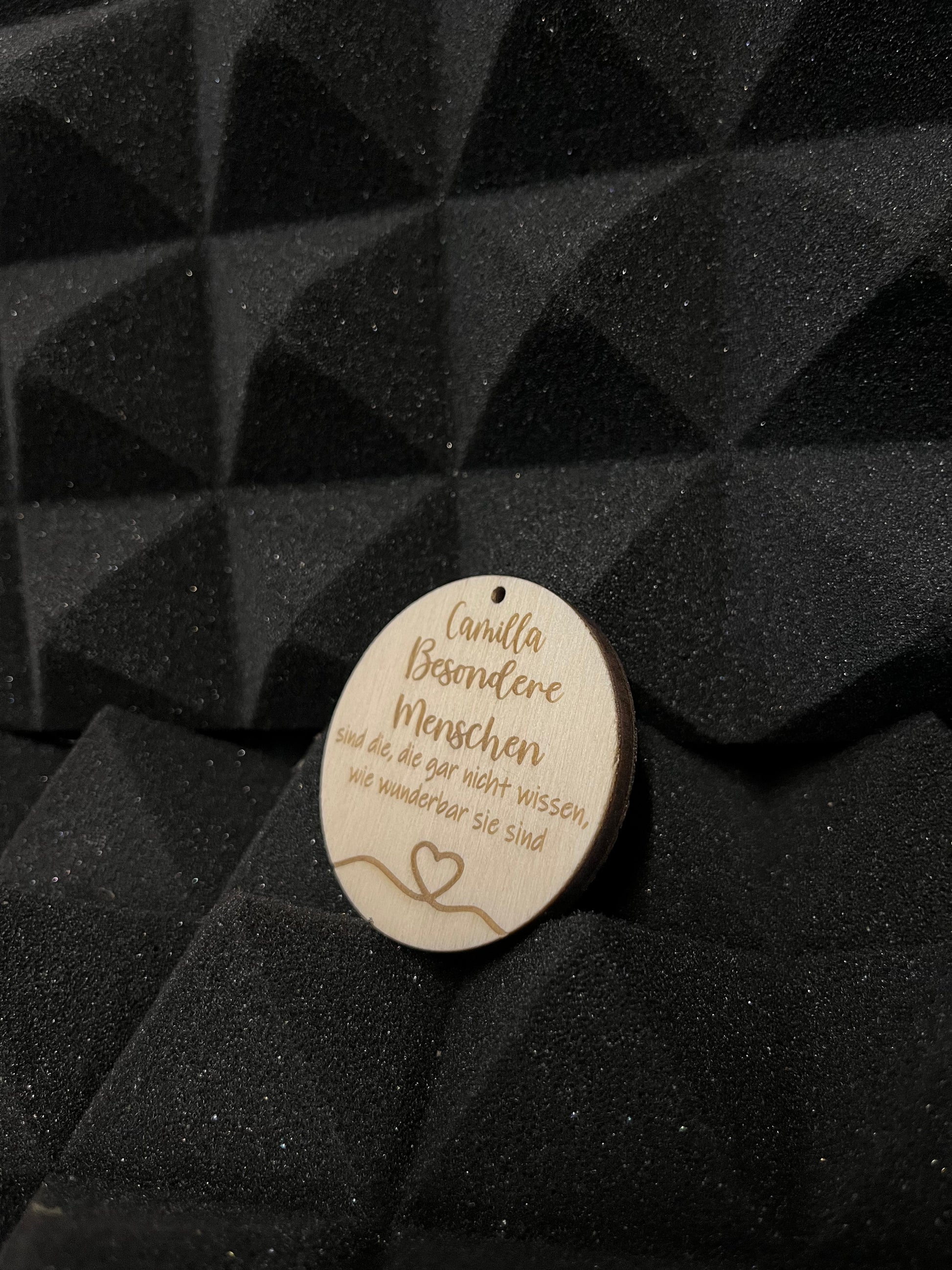 Holzscheibe mit dem Schriftzug „Besondere Menschen sind die, die garnicht wissen, wie wunderbar sie sind.“